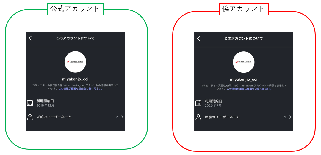都城商工会議所のインスタグラムアカウント「@miyakonjo_cci」になりすましたアカウントの存在が確認されました。